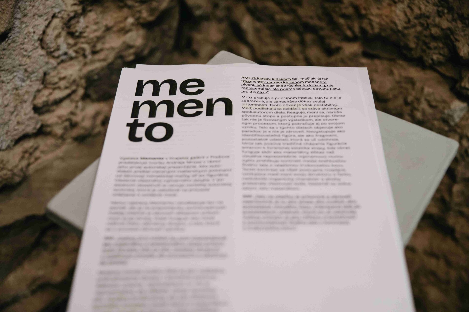 Názov výstavy Memento neodkazuje len na pamäť, ale aj na pripomienku pominuteľnosti. Každý otlačok je zároveň dôkazom prítomnosti aj jej straty. Diela fungujú ako tiché relikvie času, záznamy dotyku, a tela, ktoré sa v procese zároveň vytráca.
